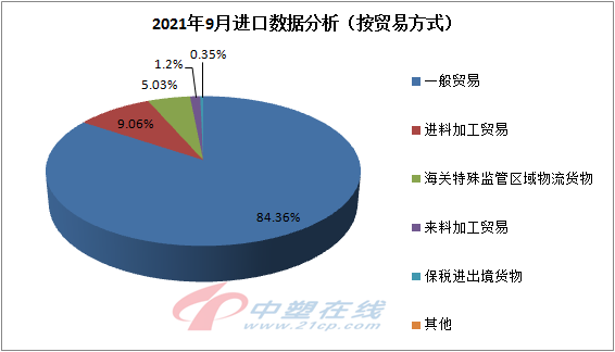 2021年9聚乙烯貿(mào)易方式方面,一般貿(mào)易領(lǐng)域占比84.36%,環(huán)比減少6.5%,進(jìn)口數(shù)量約101.59萬噸。進(jìn)料加工貿(mào)易占比9.06%,環(huán)比減少11.0%,進(jìn)口數(shù)量約10.91萬噸。海關(guān)特殊監(jiān)管區(qū)域物流貨物占比約5.03%,環(huán)比減少21.4%,進(jìn)口數(shù)量約6.06萬噸。