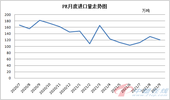 據(jù)海關(guān)統(tǒng)計(jì),2021年9月我國聚乙烯當(dāng)月進(jìn)口量在120.43萬噸,環(huán)比減少8.12%,同比減少33.78%。其中LDPE(稅則號(hào)39011000)進(jìn)口約25.14萬噸,環(huán)比減少6.19%,同比減少23.89%;HDPE(稅則號(hào)39012000)進(jìn)口約56.78萬噸,環(huán)比增減少5.08%,同比減少39.49%;LLDPE(稅則號(hào)39014020)進(jìn)口約38.51萬噸,環(huán)比減少13.36%,同比減少29.98%。1-9月累計(jì)進(jìn)口量為1126.18萬噸,同比減少33.78%。導(dǎo)致9月份中國聚乙烯進(jìn)口量同、環(huán)比雙雙回落的主要原因:1、歐美等地持續(xù)高價(jià)格的影響,中東貨源更多的被吸引;2、中國市場(7、8月份)正處于需求淡季,聚乙烯價(jià)格處低位,對(duì)中東及東南亞地區(qū)貨源吸引有限,內(nèi)外盤持續(xù)倒掛影響下,外商主動(dòng)遞盤量難有放量